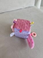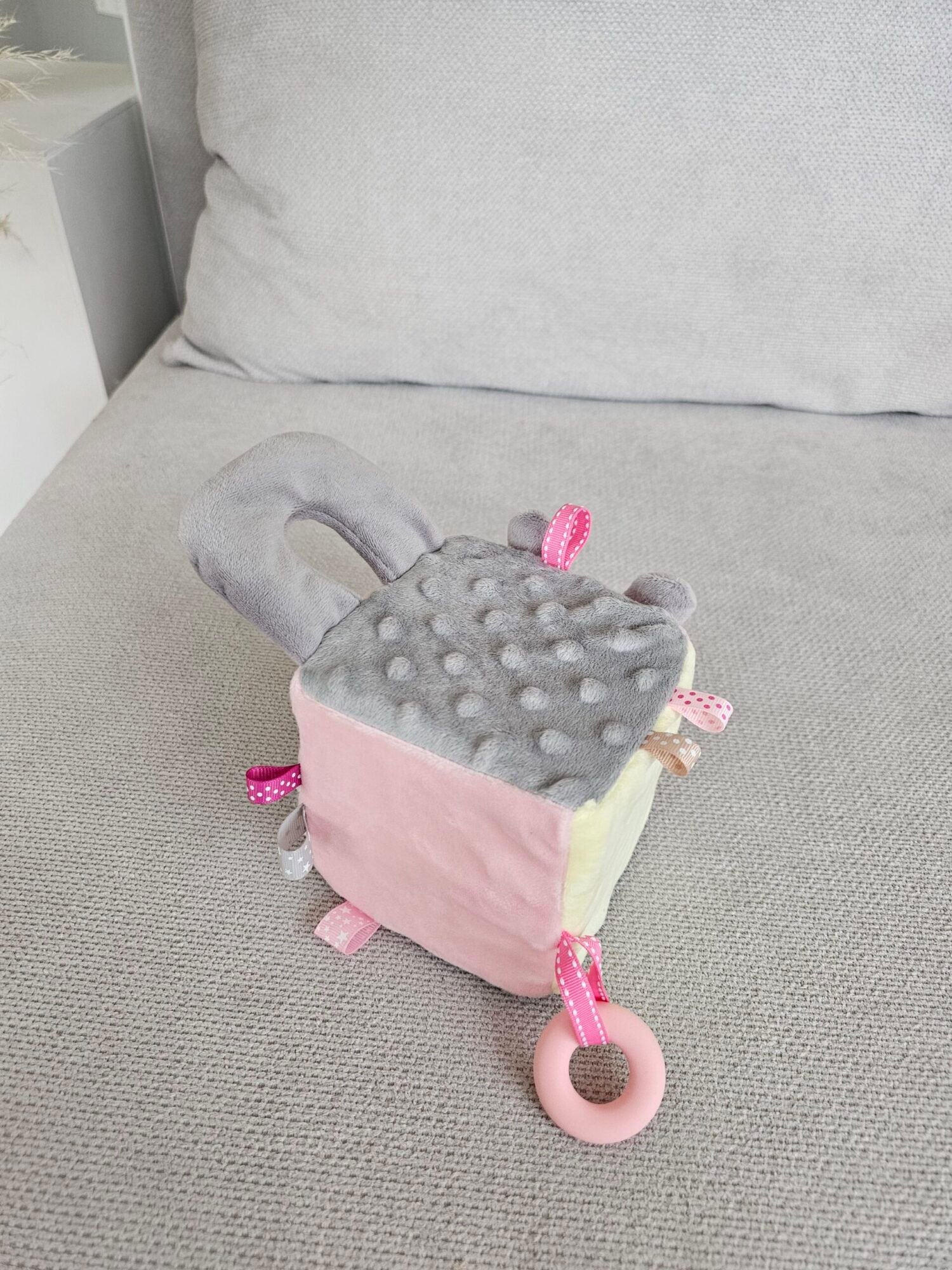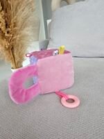 Pastelinės spalvos (žydra ir pilka arba rožinė ir pilka), švelnios tekstūros ir įsiūtas barškutis – viskas, ko reikia mažylio tyrinėjimams nuo pat pirmųjų dienų!