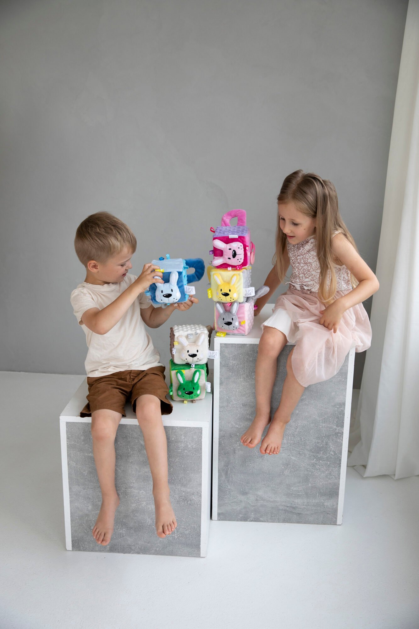 Skirtingos medžiagų faktūros, ausytės, kaspinėliai ir švelnus barškėjimas lavina regą, klausą, lytėjimą bei smulkiąją motoriką.